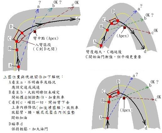 附带一点:有的人入弯倾倒的动作很快,因此C到D的耗时很短,可以延后入弯点、可以延后煞车还可以比别人更早加速,整体速度就快了不少 。