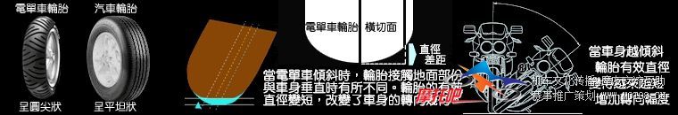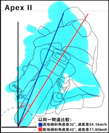 如果想要用更高的速度过弯,就必须以人的「向内倾斜」去弥补,将人车的「综合质心」移动到机车中轴线的内侧,取代人车一起倾斜的轮胎窘境