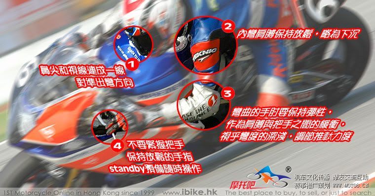答复 :虽然照书本说,外侧脚跟大腿要抵住油箱、撑住身体,可是我看GP车手也没有这样做,我也一直没做到这点,至于内侧脚跟半蹲一样,就是因为速度不够,造成车体与骑士的离心力不足(离心力祇是一个概念,并没有这种力,可以将它当成外抛的力量),身体因为侧挂而重心偏一边,离心力不足之下,没有抵销身体向内的重力,所以要靠内侧腿来支撑;